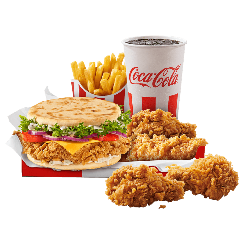 1 Crispy Naan Creamy Yoghurt Nepicant (230g), 4 Hot Wings® (100g), 1 porție mare de cartofi prăjiți (90g), 1 răcoritoare la pahar (0.4L)