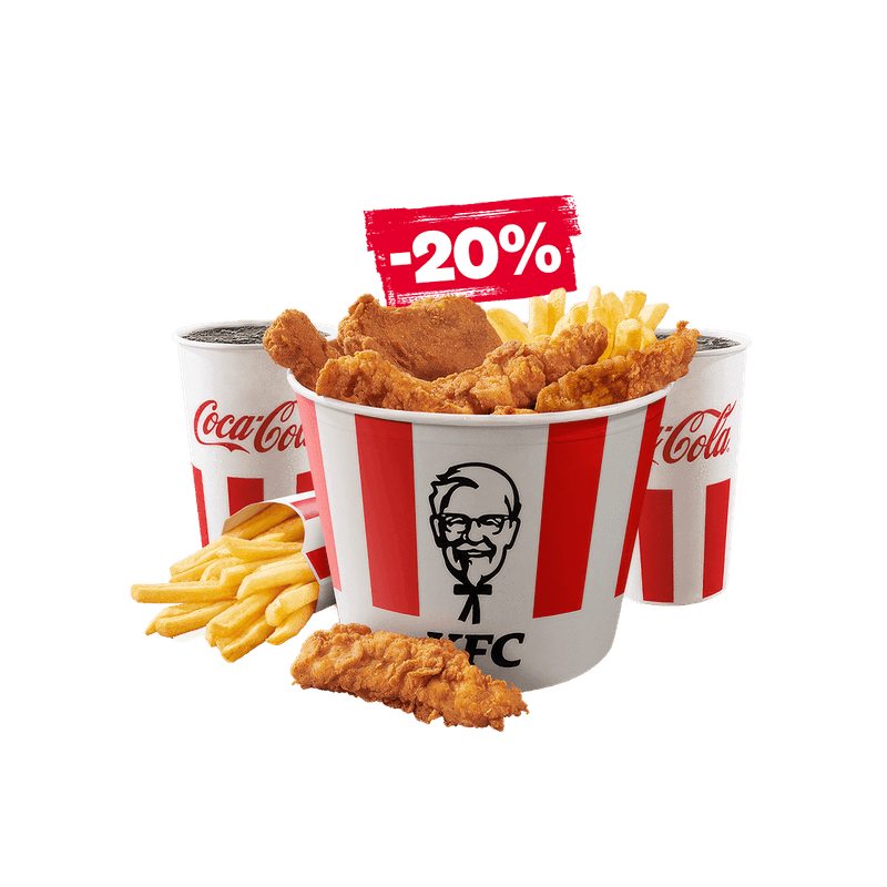 2 bucăți de pui Kentucky, 4 Strips Nepicanți, 2 porții medii de cartofi prăjiți și 2 băuturi răcoritoare Coca-Cola/ Coca-Cola Zero/ Fanta/ Sprite la 0.4L